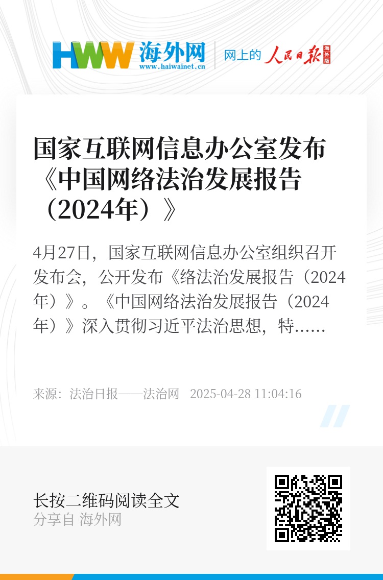 4月27日,国家互联网信息办公室组织召开发布会,公开发布《中国网络法治发展报告(2024年)》。