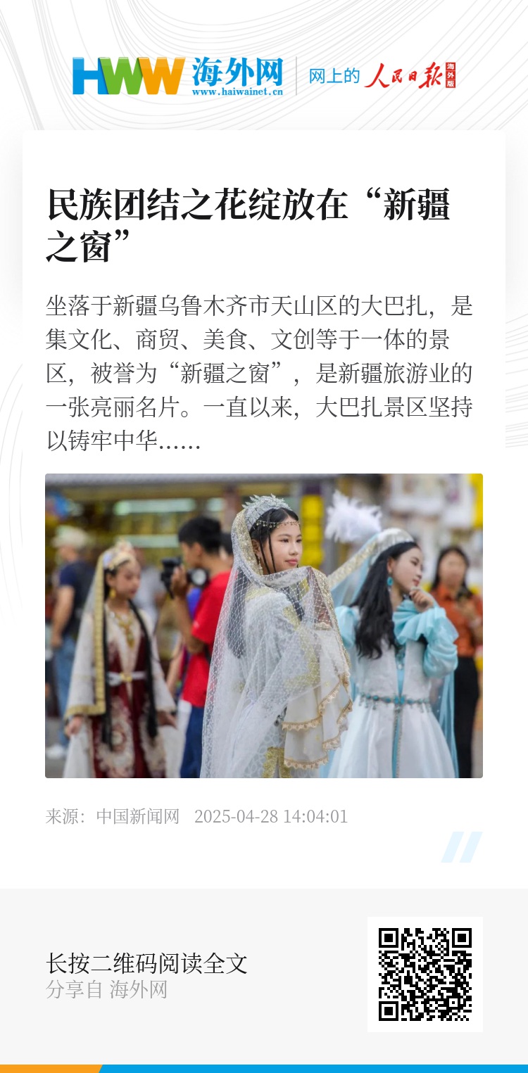 “我们还通过小程序向商户、游客推送邻里互助、情同手足的故事。”白昀剑说,大巴扎景区正是新疆各族群众携手共谱“同心圆”的一个缩影。