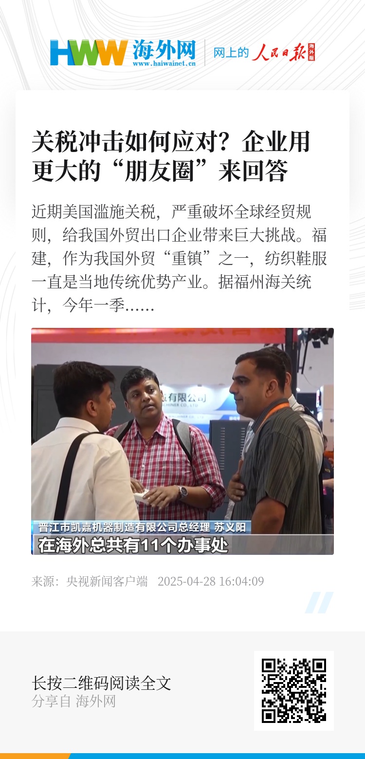 这些天,为了帮助企业缓解出口压力,晋江当地的政府、行业协会、商会组织也在积极行动,提供展会等供需对接结活动,帮助企业寻找合作商机。