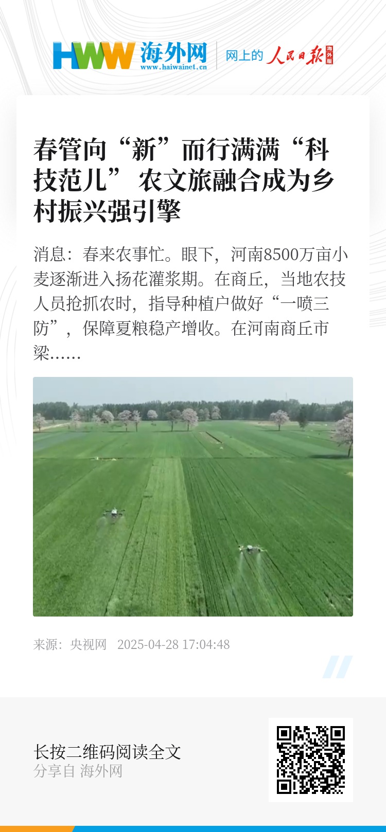央视网消息:春来农事忙。眼下,河南8500万亩小麦逐渐进入扬花灌浆期。在商丘,当地农技人员抢抓农时,指导种植户做好“一喷三防”,保障夏粮稳产增收。
