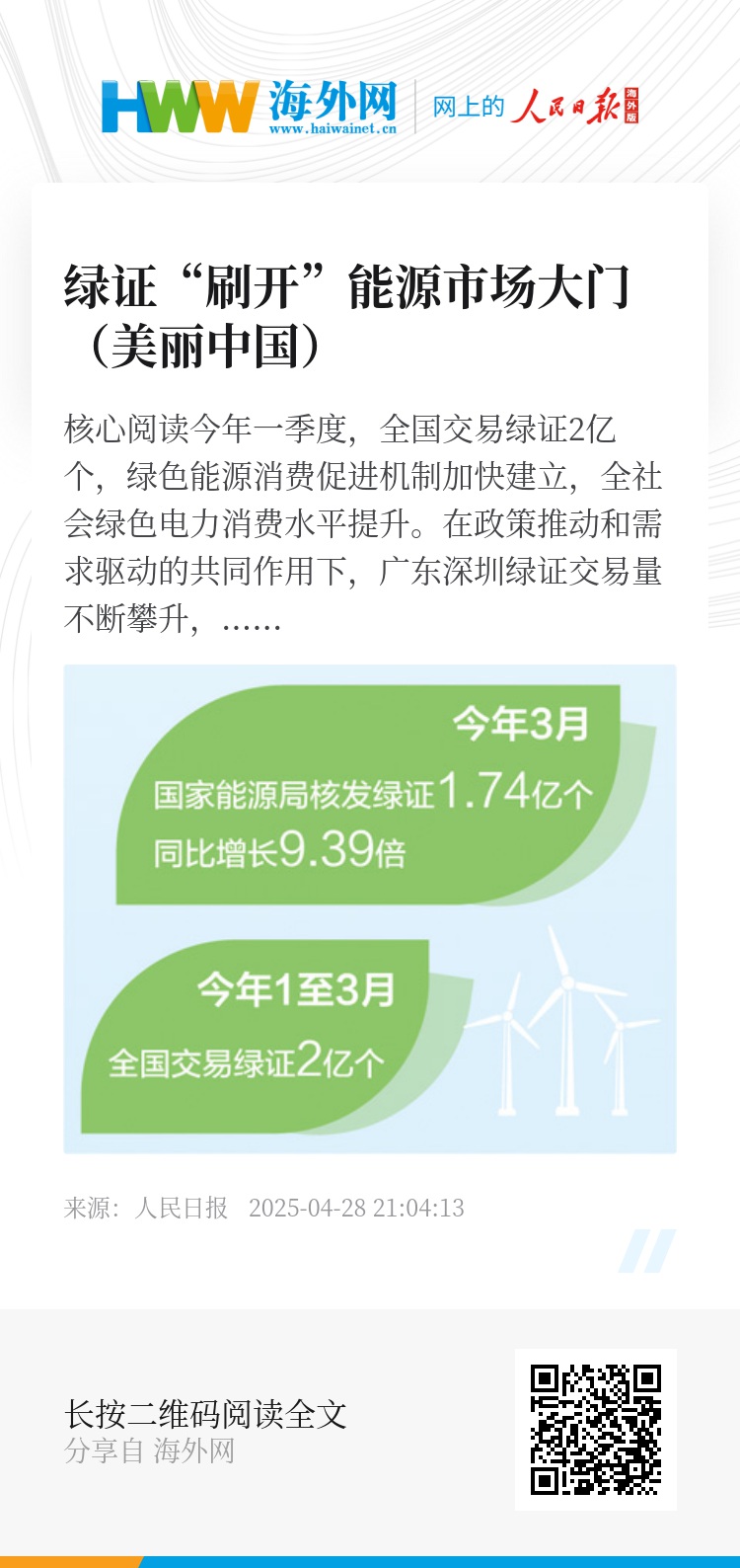 今年一季度,全国交易绿证2亿个,绿色能源消费促进机制加快建立,全社会绿色电力消费水平提升。