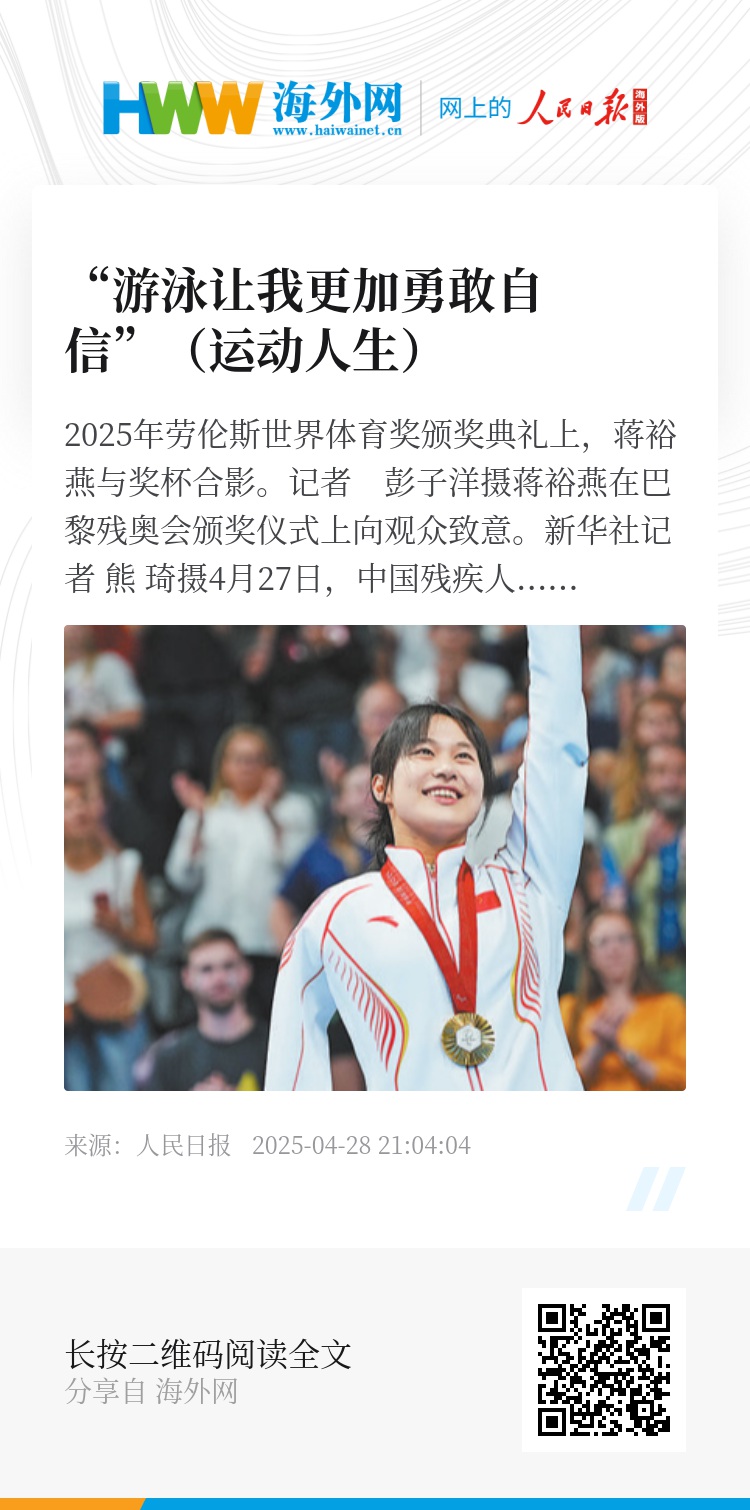 过几天,蒋裕燕又将回到训练场,准备接下来的一系列赛事。“我会继续专注于脚下的路,继续在泳池里坚持自己热爱的事情。”她说,“身体有残缺其实并不可怕,只要你不给自己设限,大胆去尝试、去想象,你能做到的远比想象的更多。”
