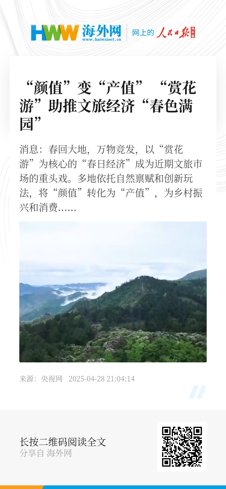 央视网消息:春回大地,万物竞发,以“赏花游”为核心的“春日经济”成为近期文旅市场的重头戏。多地依托自然禀赋和创新玩法,将“颜值”转化为“产值”,为乡村振兴和消费升级注入新动能。眼下,浙江天台山主峰华顶的300多亩云锦杜鹃陆续开放,吸引了不少游客前来登山赏花。“五一”假期就要到了,跟随记者的镜头一起去看看吧。