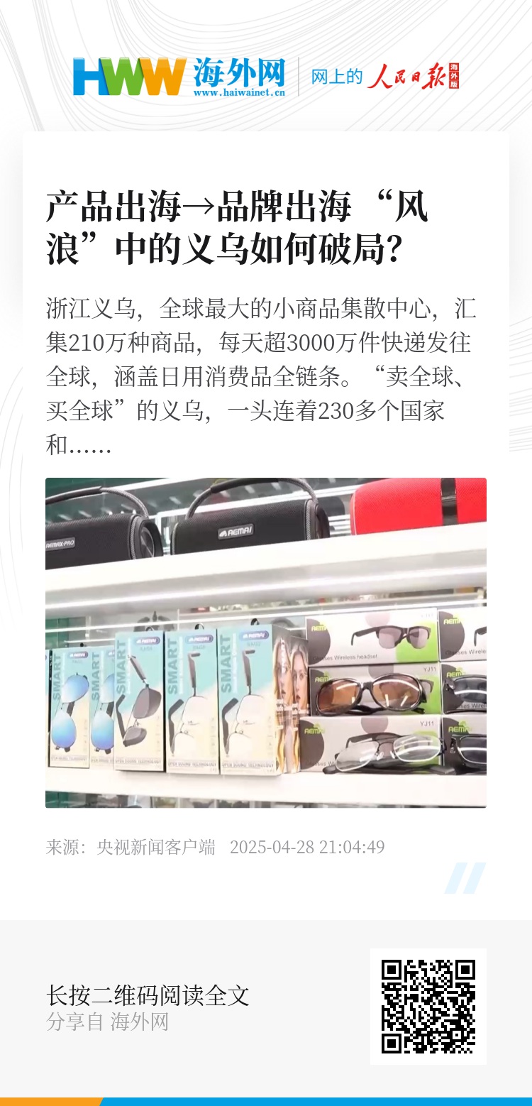 为应对关税冲击,义乌的一些商家积极调整策略,优化生产流程、减少备货和成品库存。产品哪怕涨价,依然有竞争力。但是,要让中国的外贸实现可持续高质量发展,还需要摆脱过去“外贸代工”“低价低质”的刻板印象,实现品牌化管理,从“中国制造”向“中国创造”转变。那为了实现这个目标,义乌又是怎么做的?哪些人在努力?