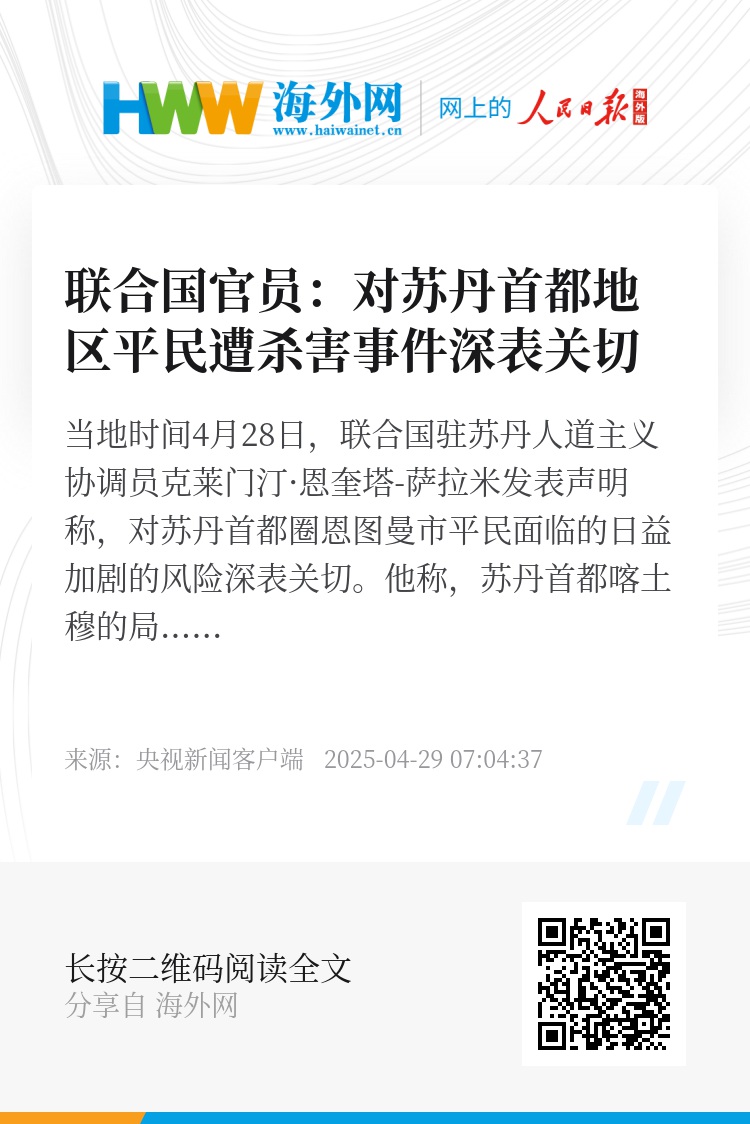 当地时间4月28日,联合国驻苏丹人道主义协调员克莱门汀·恩奎塔-萨拉米发表声明称,对苏丹首都圈恩图曼市平民面临的日益加剧的风险深表关切。他称,苏丹首都喀土穆的局势依然岌岌可危。