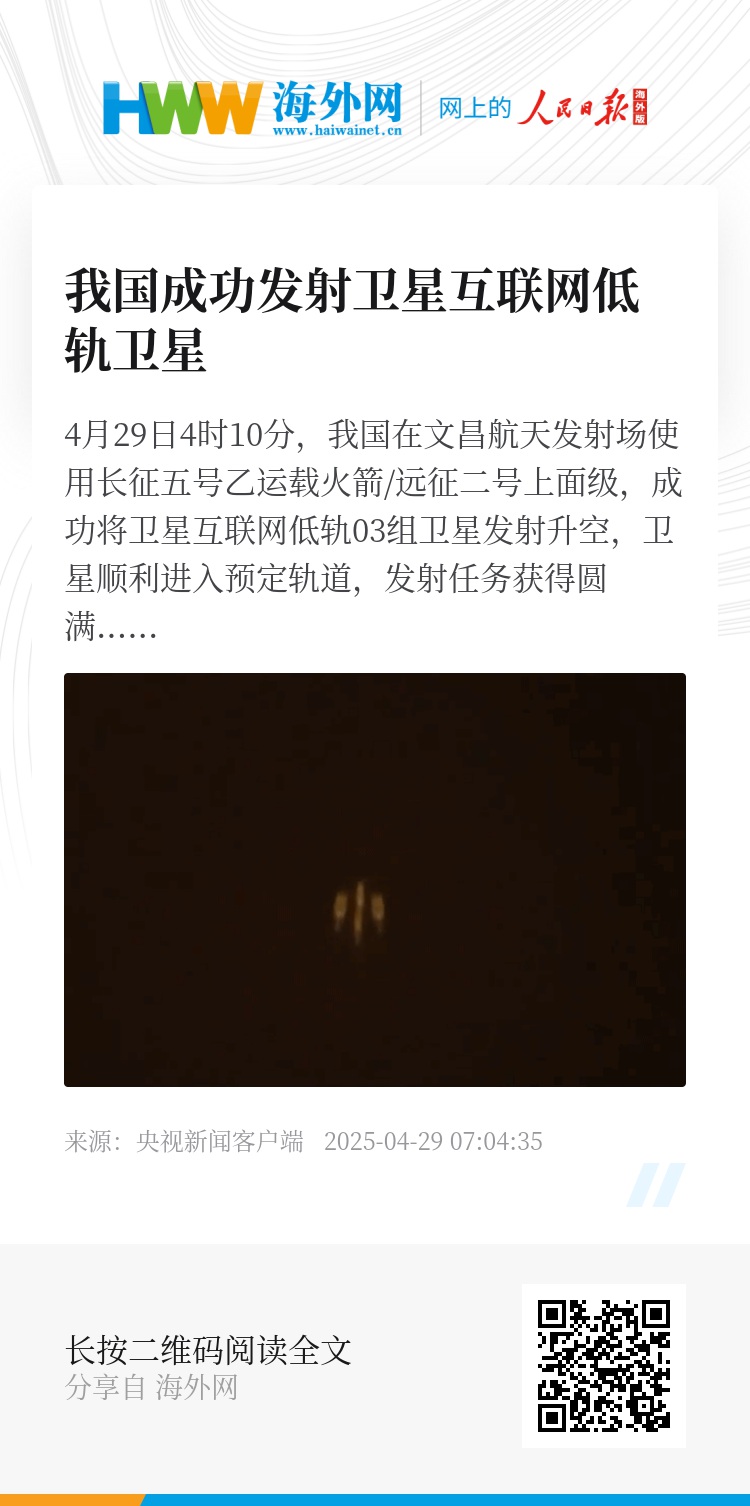 4月29日4时10分,我国在文昌航天发射场使用长征五号乙运载火箭/远征二号上面级,成功将卫星互联网低轨03组卫星发射升空,卫星顺利进入预定轨道,发射任务获得圆满成功。