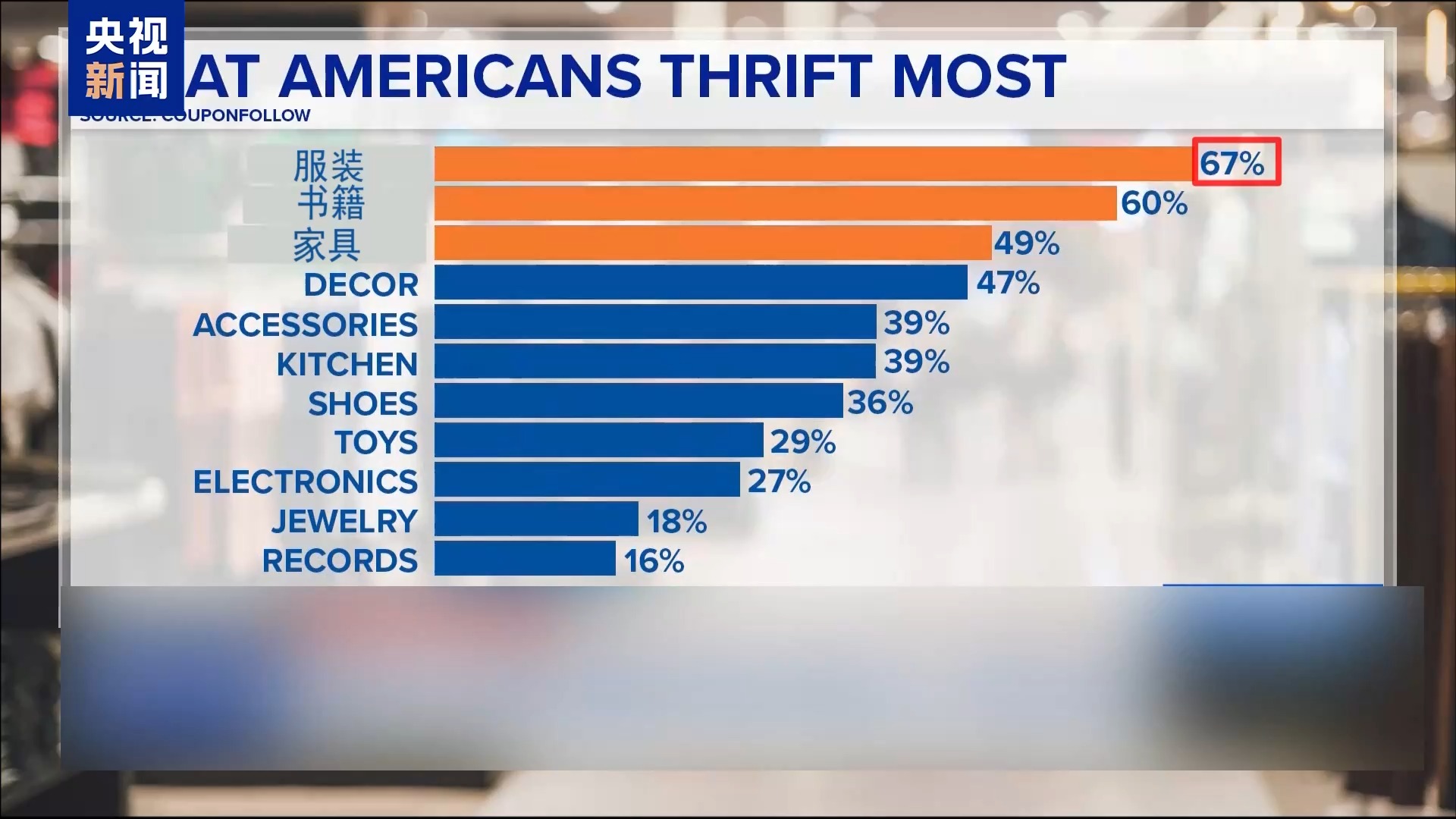 美国一家在线交易平台(CouponFollow)的一组调查数据显示,67%的美国消费者选择在二手市场购买服装,60%的人购买书籍,近50%的人购买家具。