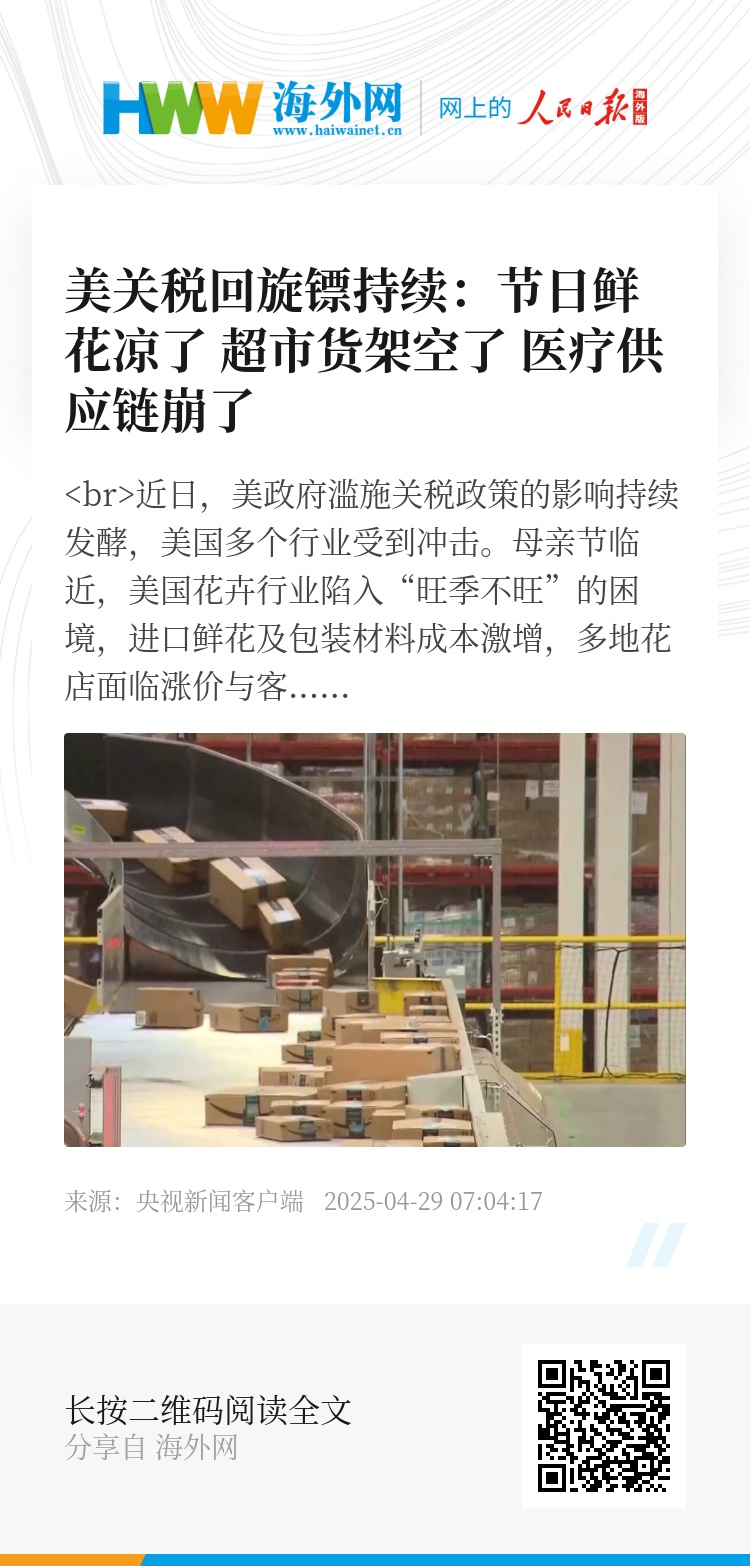 近日,美政府滥施关税政策的影响持续发酵,美国多个行业受到冲击。母亲节临近,美国花卉行业陷入“旺季不旺”的困境,进口鲜花及包装材料成本激增,多地花店面临涨价与客源流失的双重压力。与此同时,关税冲击波正蔓延至消费品和医疗领域,美国零售业面临物价上涨与“空货架危机”;民众纷纷转向二手店,二手市场交易量飙升;医疗用品公司则每日召开“关税作战会议”应对供应链断裂风险。