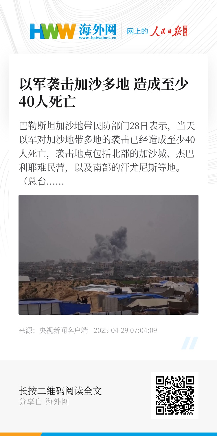 巴勒斯坦加沙地带民防部门28日表示,当天以军对加沙地带多地的袭击已经造成至少40人死亡,袭击地点包括北部的加沙城、杰巴利耶难民营,以及南部的汗尤尼斯等地。(总台记者 李享)