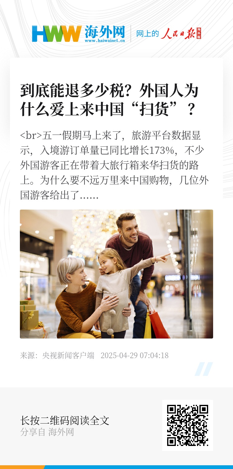 五一假期马上来了,旅游平台数据显示,入境游订单量已同比增长173%,不少外国游客正在带着大旅行箱来华扫货的路上。为什么要不远万里来中国购物,几位外国游客给出了他们的答案,那就是除了更好的商品、更多的选择外,更便捷的服务也很重要。