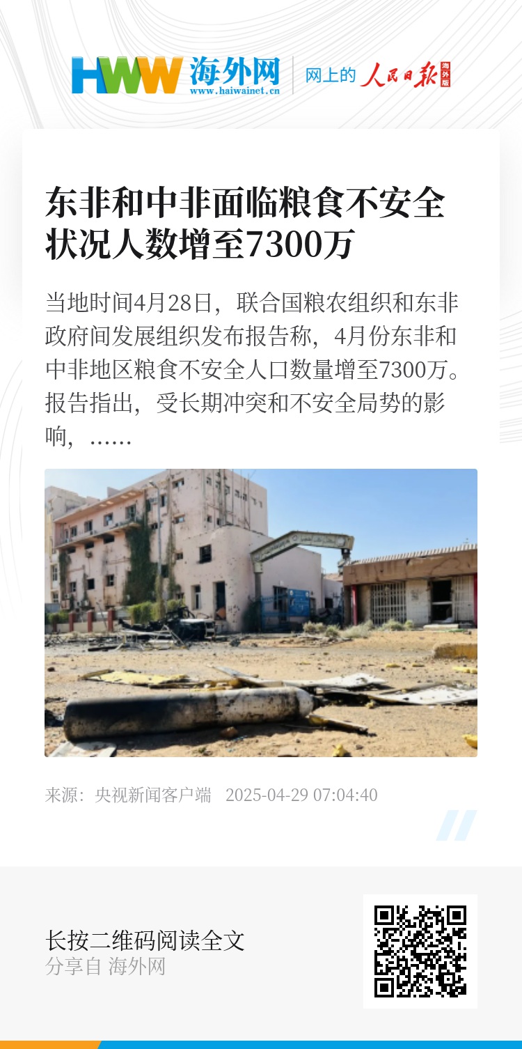 当地时间4月28日,联合国粮农组织和东非政府间发展组织发布报告称,4月份东非和中非地区粮食不安全人口数量增至7300万。