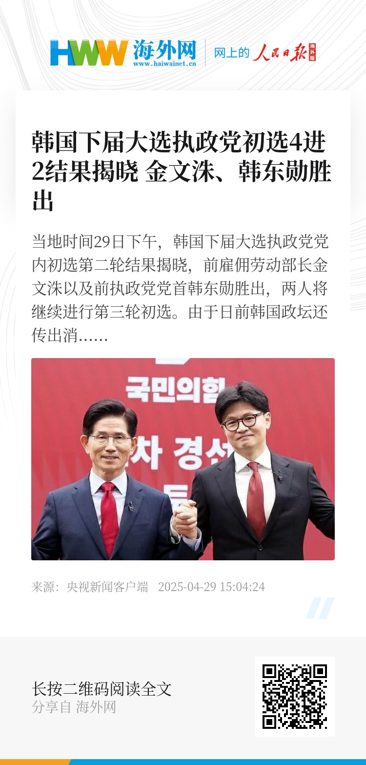 当地时间29日下午,韩国下届大选执政党党内初选第二轮结果揭晓,前雇佣劳动部长金文洙以及前执政党党首韩东勋胜出,两人将继续进行第三轮初选。由于日前韩国政坛还传出消息称代总统韩德洙也有可能辞去公职参选,并有可能和执政党候选人“合并”成单一候选人,因此谁将代表执政党参选目前尚不明朗。