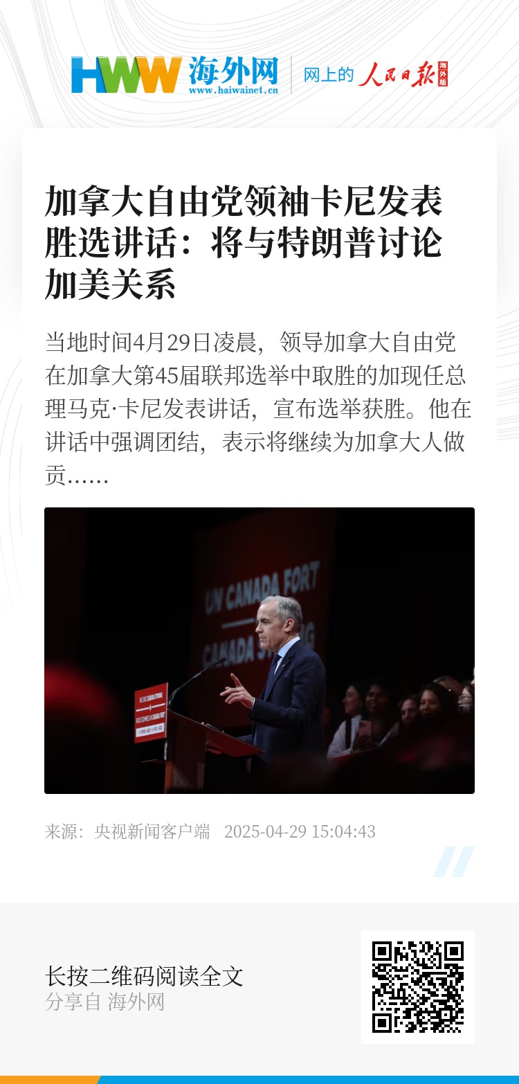 当地时间4月29日凌晨,领导加拿大自由党在加拿大第45届联邦选举中取胜的加现任总理马克·卡尼发表讲话,宣布选举获胜。他在讲话中强调团结,表示将继续为加拿大人做贡献,期待与议会各党派进行建设性合作。卡尼还表示,将与美国总统特朗普坐下来讨论两个主权国家之间未来的经济和安全关系。