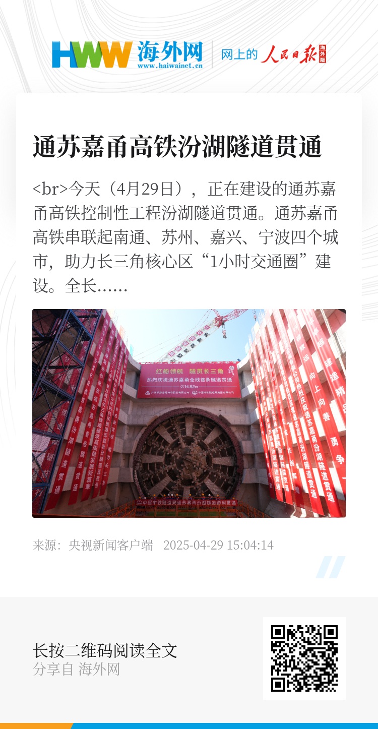 今天(4月29日),正在建设的通苏嘉甬高铁控制性工程汾湖隧道贯通。通苏嘉甬高铁串联起南通、苏州、嘉兴、宁波四个城市,助力长三角核心区“1小时交通圈”建设。