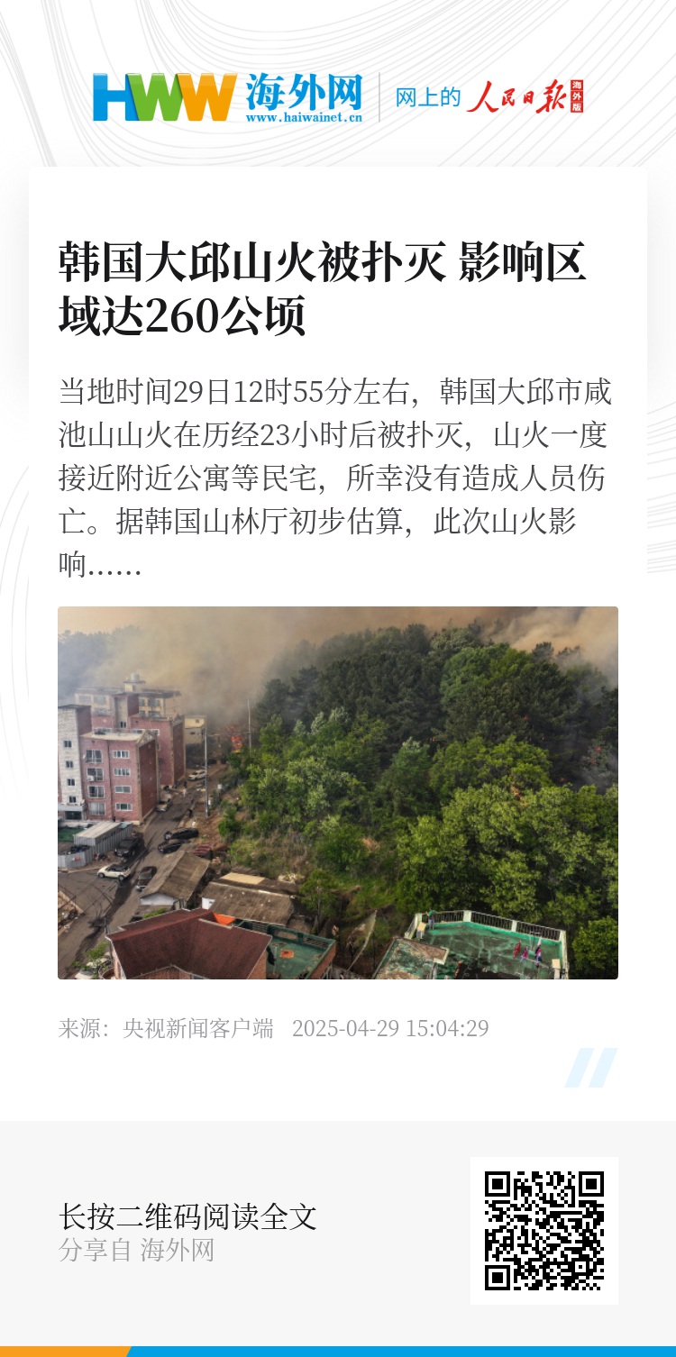 当地时间29日12时55分左右,韩国大邱市咸池山山火在历经23小时后被扑灭,山火一度接近附近公寓等民宅,所幸没有造成人员伤亡。据韩国山林厅初步估算,此次山火影响区域达到260公顷,受灾面积在进一步调查后有可能将进一步增加。