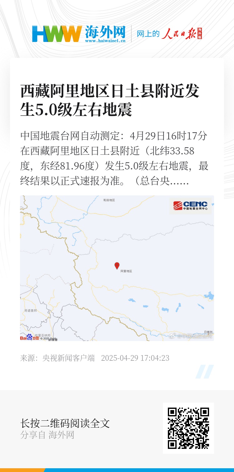 中国地震台网自动测定:4月29日16时17分在西藏阿里地区日土县附近(北纬33.58度,东经81.96度)发生5.0级左右地震,最终结果以正式速报为准。