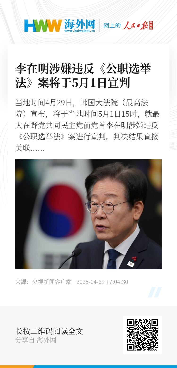 当地时间4月29日,韩国大法院(最高法院)宣布,将于当地时间5月1日15时,就最大在野党共同民主党前党首李在明涉嫌违反《公职选举法》案进行宣判。