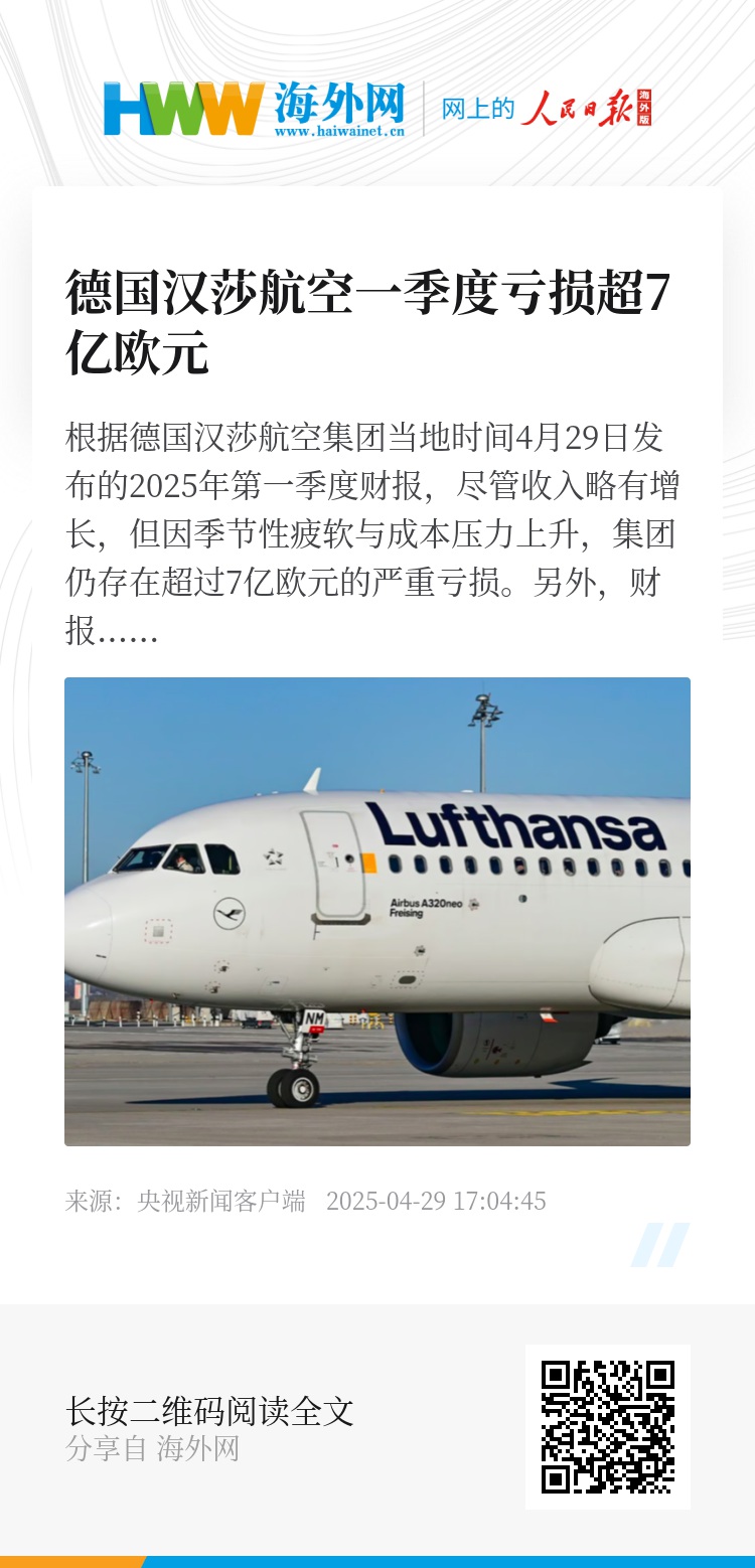 根据德国汉莎航空集团当地时间4月29日发布的2025年第一季度财报,尽管收入略有增长,但因季节性疲软与成本压力上升,集团仍存在超过7亿欧元的严重亏损。另外,财报警告称,美国持续推进的贸易保护主义政策或将对全球航空市场,特别是跨大西洋航线造成外溢性冲击。