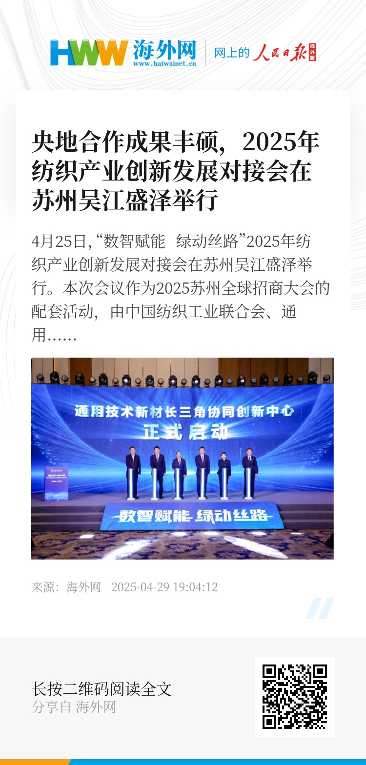 此次会议不仅为纺织行业搭建了高规格的交流平台,更为盛泽乃至全国纺织产业的高质量发展按下“加速键”。在数智与绿色的双轮驱动下,这条千年“丝路”正焕发出新的生机与活力。