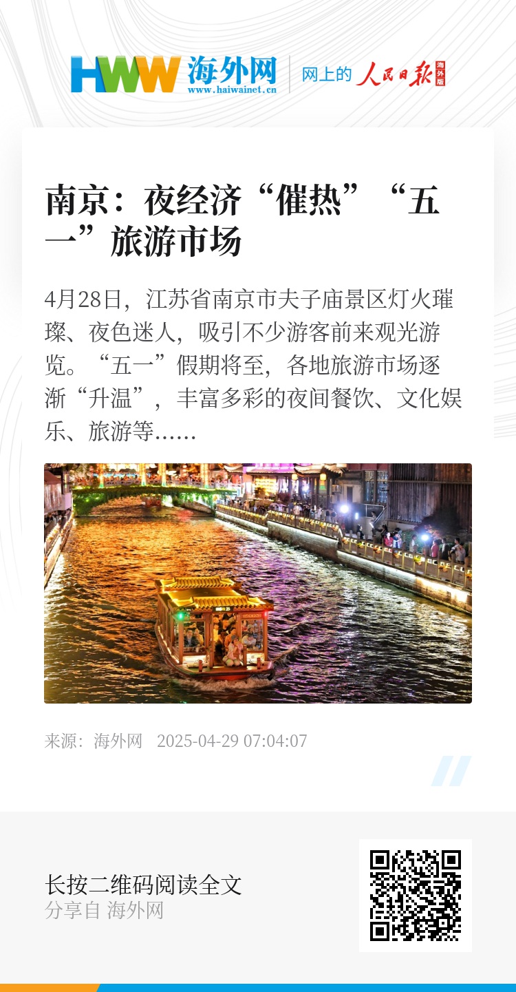 4月28日,江苏省南京市夫子庙景区灯火璀璨、夜色迷人,吸引不少游客前来观光游览。“五一”假期将至,各地旅游市场逐渐“升温”,丰富多彩的夜间餐饮、文化娱乐、旅游等活动,在满足游客休闲度假需求的同时,有效拉动旅游经济和消费市场。图源:东方IC