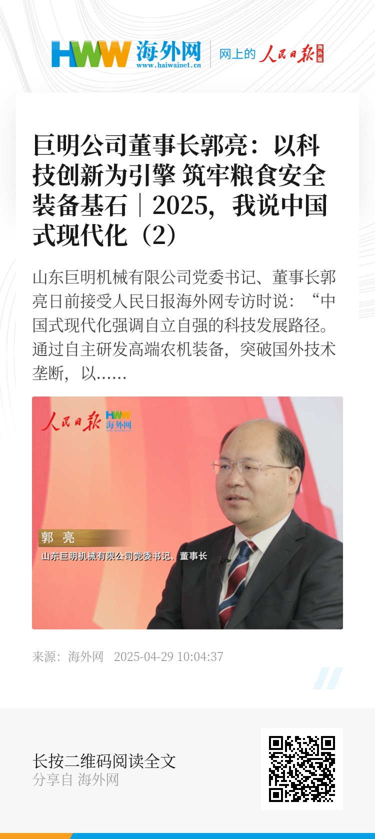 山东巨明机械有限公司党委书记、董事长郭亮日前接受人民日报海外网专访时说:“中国式现代化强调自立自强的科技发展路径。通过自主研发高端农机装备,突破国外技术垄断,以‘弯道超车’的方式推动农业机械化从‘跟跑’向‘领跑’转变,这是国家与民族的需要。”