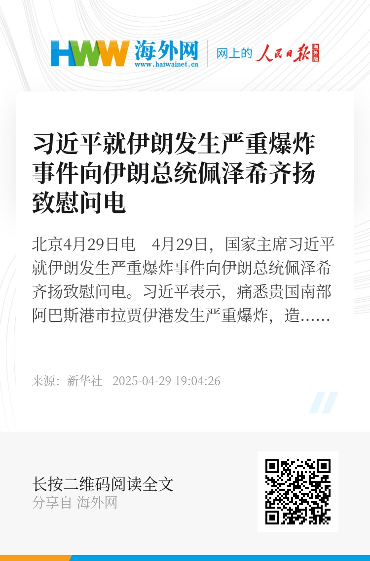 新华社北京4月29日电 4月29日,国家主席习近平就伊朗发生严重爆炸事件向伊朗总统佩泽希齐扬致慰问电。
