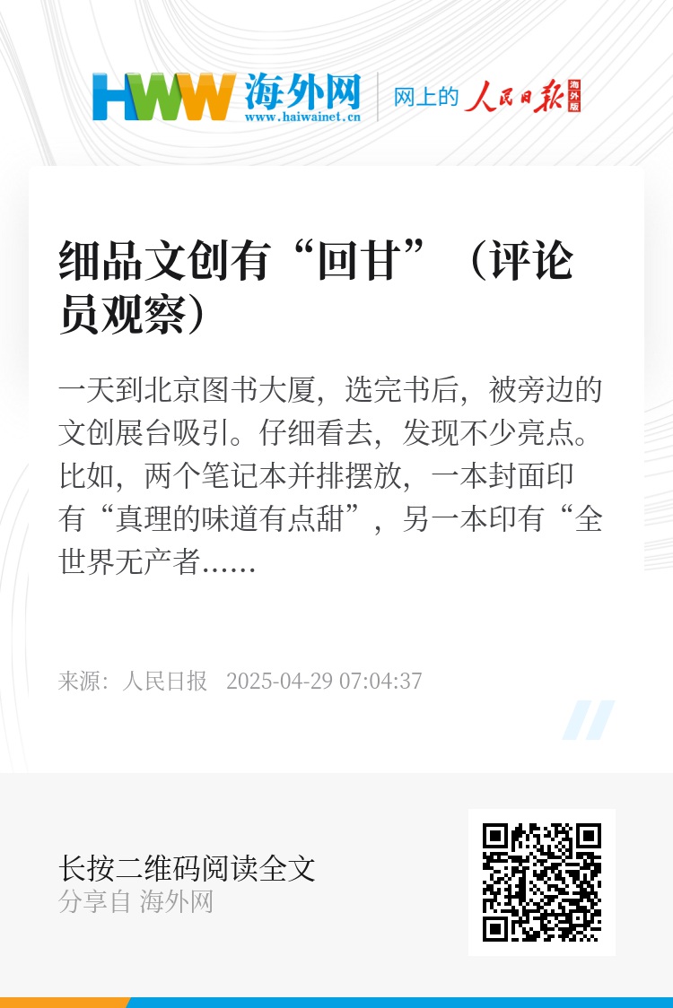 有人购买文创产品后,发出这样的感慨,“感到一种召唤”。强化文化熏陶、丰富阅读体验之外,文创仿佛还有一种力量,即增强文化自信,吸引更多年轻人投身文化传承。从小喜欢收藏“手办”的90后曾舟,受三星堆博物馆馆藏文物启发,设计出青铜像系列文物潮玩,斩获大奖,也赢得市场。当越来越多年轻人把创意与智慧融入文创,当“沉淀千年的文化”随手可以触摸,文化赓续便拥有了生生不息的青春力量。这或可看作更深层次的“回甘”。