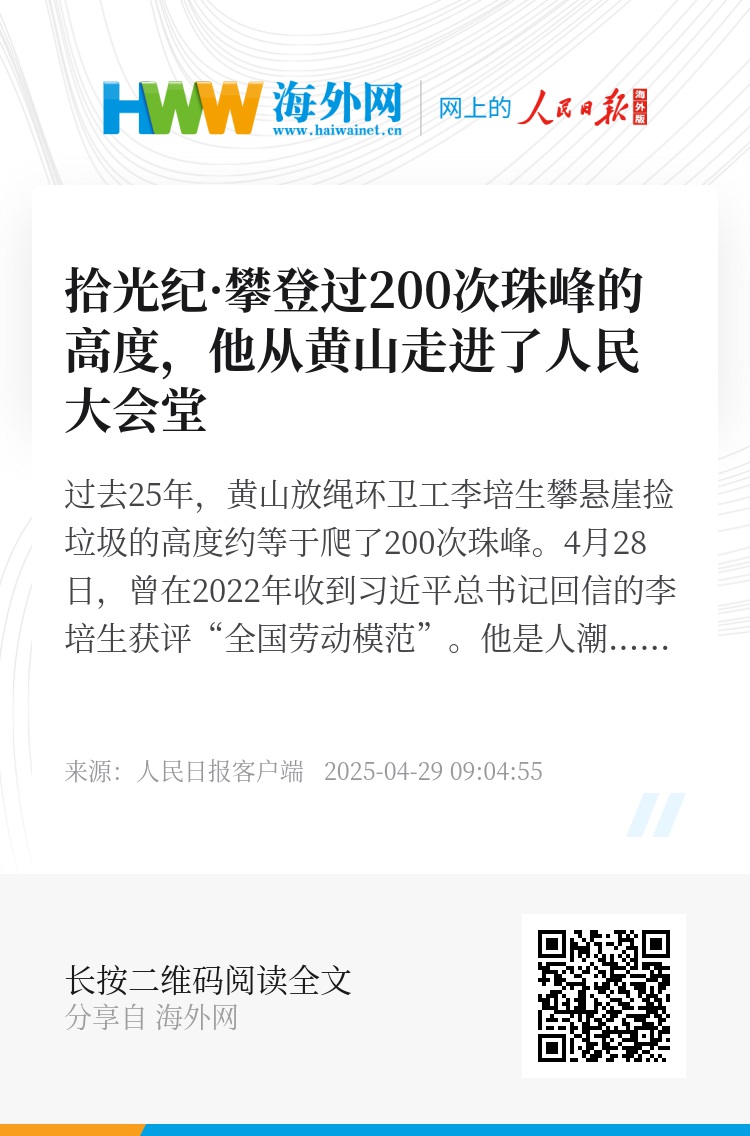 过去25年,黄山放绳环卫工李培生攀悬崖捡垃圾的高度约等于爬了200次珠峰。4月28日,曾在2022年收到习近平总书记回信的李培生获评“全国劳动模范”。他是人潮汹涌旁的峭壁孤勇,更是万千劳动者的时代缩影。