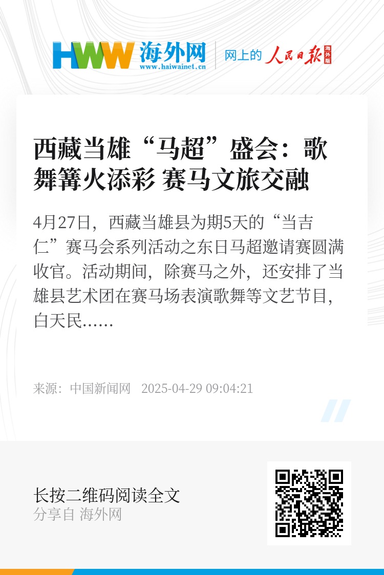 4月27日,西藏当雄县为期5天的“当吉仁”赛马会系列活动之东日马超邀请赛圆满收官。活动期间,除赛马之外,还安排了当雄县艺术团在赛马场表演歌舞等文艺节目,白天民众享受来自藏北草原的艺术盛宴,夜晚民间艺人与民众围着篝火跳锅庄舞,营造全时段欢乐氛围。活动进一步传承和弘扬非物质文化遗产,提升当雄文旅知名度,促进各民族交往交流交融,推动赛马与文旅产业深度融合,打造特色“马超”品牌。(贡桑拉姆 贡嘎来松)