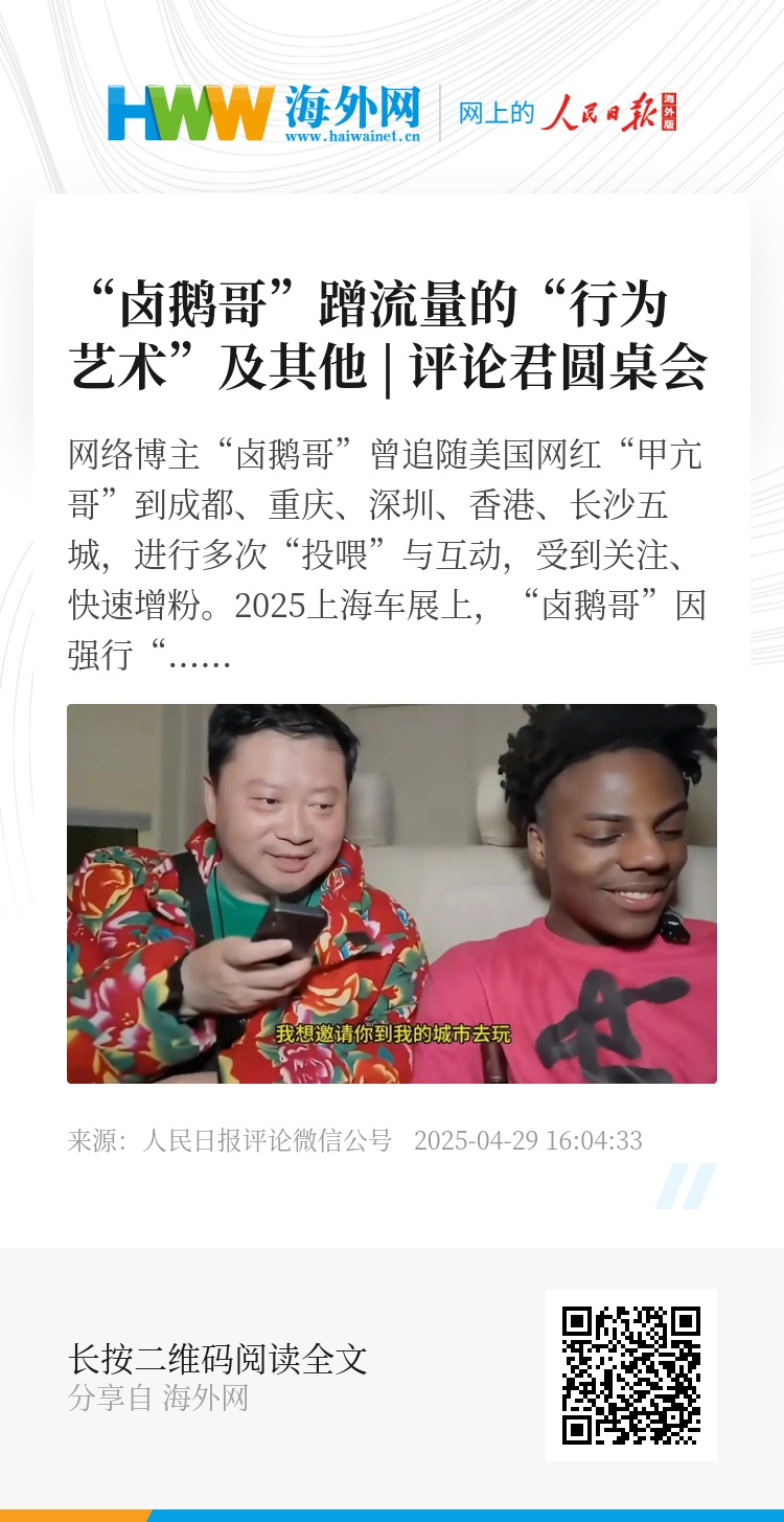 网络博主“卤鹅哥”曾追随美国网红“甲亢哥”到成都、重庆、深圳、香港、长沙五城,进行多次“投喂”与互动,受到关注、快速增粉。2025上海车展上,“卤鹅哥”因强行“投喂”企业家周鸿祎被拒,与他人拉扯,被网友批为“失态”“过火”,凸显网红行为与商业场景的冲突。风波过后,周鸿祎前往重庆荣昌,与“卤鹅哥”一起直播,再次引发热议。“卤鹅哥”现象怎么看?评论君也在交流。现将讨论摘录,与大家一起激荡思考。