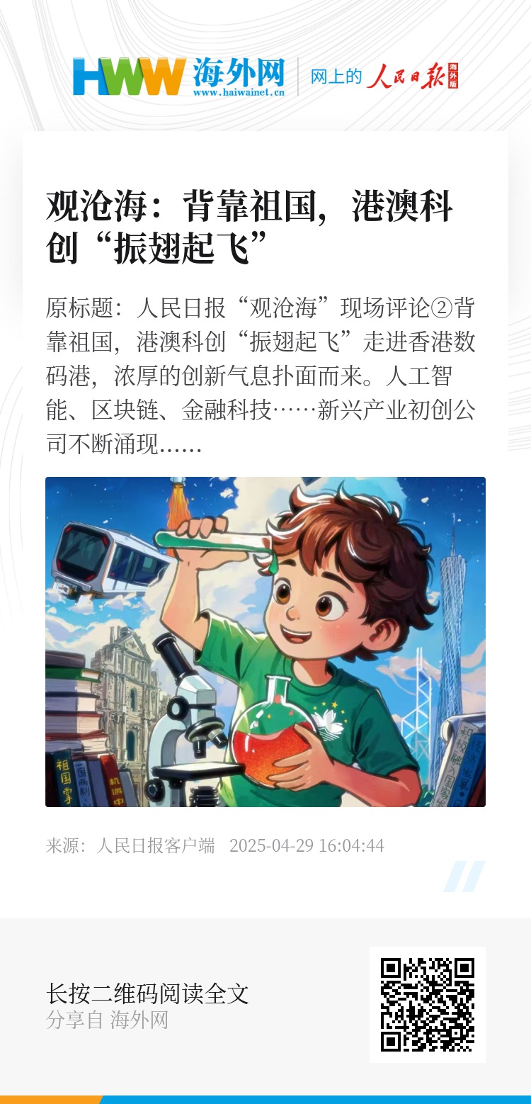 “科技创新,就像撬动地球的杠杆,总能创造令人意想不到的奇迹。”当前,港澳科创事业发展生机勃勃,正迎来黄金机遇。只要充分发挥“背靠祖国、联通世界”的独特优势,积极融入大湾区科创生态圈,港澳一定能充分激发科创活力,谱写高质量发展新篇章!(人民日报客户端 汪灵犀)