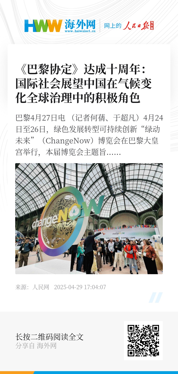 人民网巴黎4月27日电 (记者何蒨、于超凡)4月24日至26日,绿色发展转型可持续创新“绿动未来”(ChangeNow)博览会在巴黎大皇宫举行,本届博览会主题旨在纪念《巴黎协定》达成十周年。巴黎联合国气候变化大会主席洛朗·法比尤斯、联合国政府间气候变化专门委员会副主席戴安娜·尤尔格·沃萨茨、法国能源转型部长阿涅丝·帕尼耶·吕纳谢、沙特阿拉伯环境部副部长及COP16主席顾问乌萨马·法姬哈、以及巴西环境与气候变化国务秘书兼COP30首席执行官安娜·托尼等政府代表出席博览会开幕式并致辞。人民网记者就《巴黎协定》十周年的议题进行了专访。