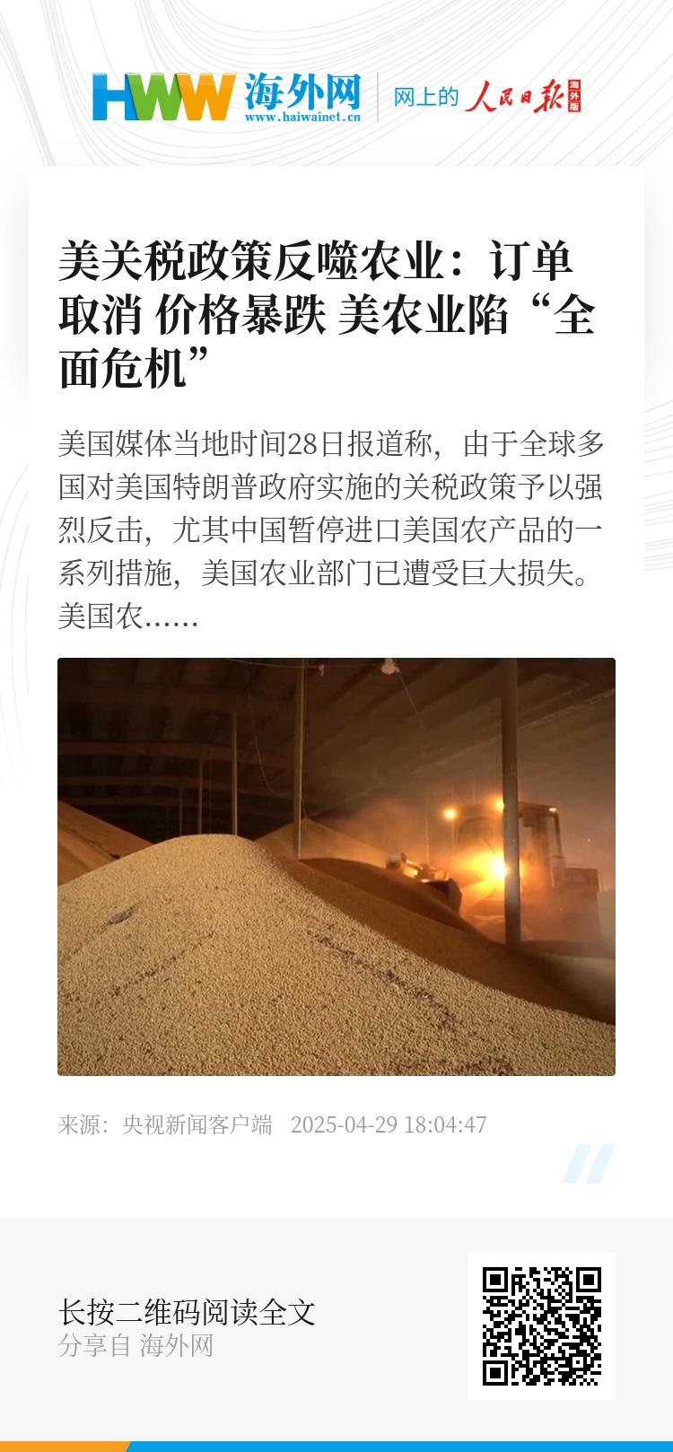 美国媒体当地时间28日报道称,由于全球多国对美国特朗普政府实施的关税政策予以强烈反击,尤其中国暂停进口美国农产品的一系列措施,美国农业部门已遭受巨大损失。