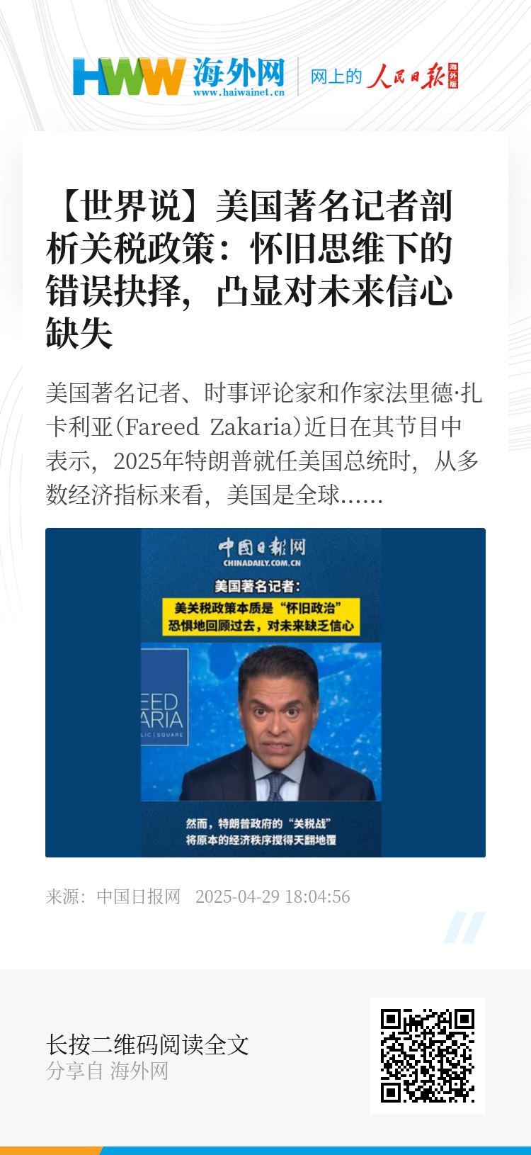 美国著名记者、时事评论家和作家法里德·扎卡利亚(Fareed Zakaria)近日在其节目中表示,2025年特朗普就任美国总统时,从多数经济指标来看,美国是全球最强大的主要经济体。他认为彼时的美国经济实现增长,失业率和通胀已降至可控水平。然而,现任政府大幅提高关税的举措,如同一场风暴,将原本的经济秩序搅得天翻地覆。