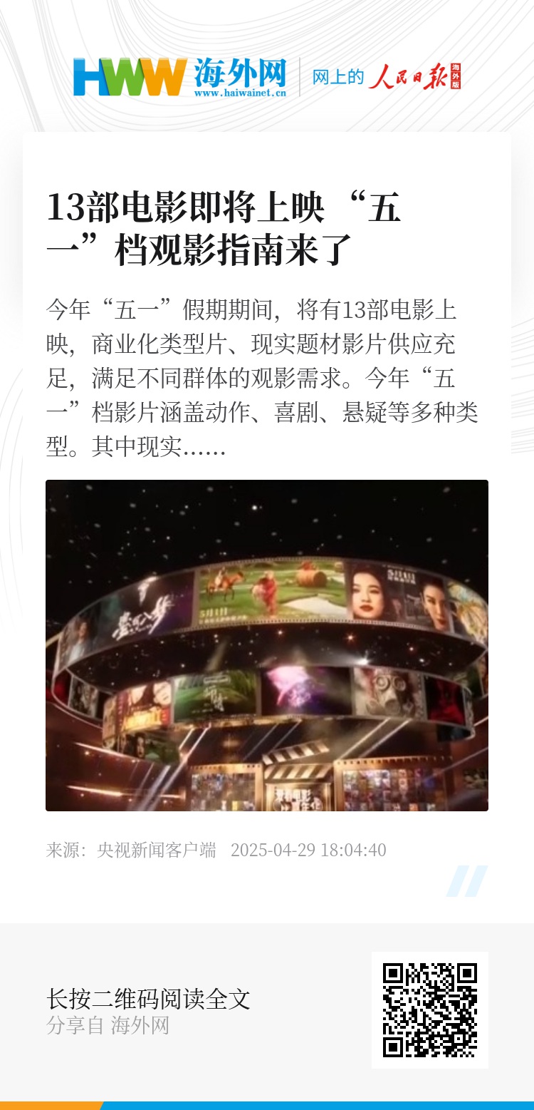 今年“五一”假期期间,将有13部电影上映,商业化类型片、现实题材影片供应充足,满足不同群体的观影需求。