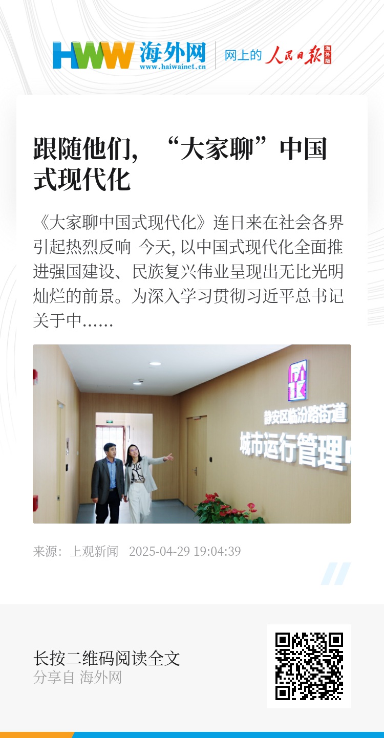为深入学习贯彻习近平总书记关于中国式现代化的重要论述,深入学习贯彻落实党的二十大和二十届三中全会精神,在中共上海市委宣传部指导下,中共上海市委网信办、中共上海市委外宣办、上海社科院与文汇报社联合出品的《大家聊中国式现代化》系列短视频7集在全网推出后,连日来在社会各界引起热烈反响。