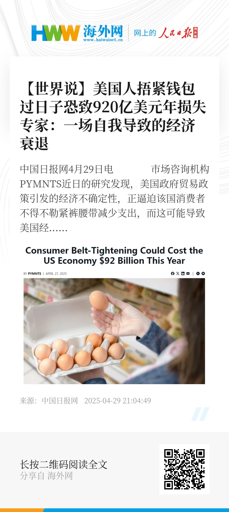 中国日报网4月29日电 市场咨询机构PYMNTS近日的研究发现,美国政府贸易政策引发的经济不确定性,正逼迫该国消费者不得不勒紧裤腰带减少支出,而这可能导致美国经济每年蒸发920亿美元(约合6682.3亿元人民币)。