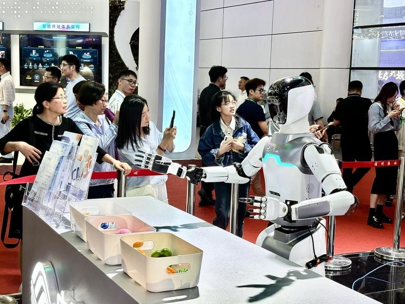 第八届数字中国建设峰会现场,游客驻足围观人形机器人。(郑雅梅 摄)