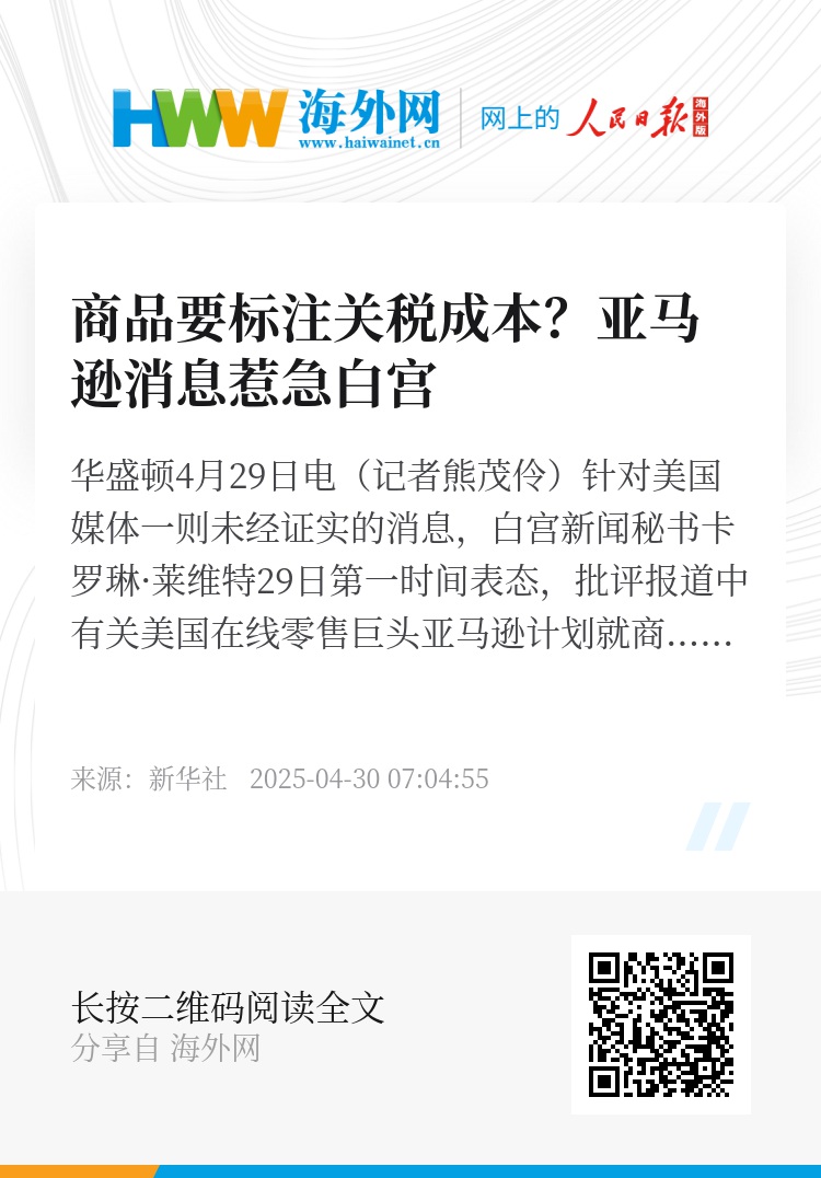 新华社华盛顿4月29日电(记者熊茂伶)针对美国媒体一则未经证实的消息,白宫新闻秘书卡罗琳·莱维特29日第一时间表态,批评报道中有关美国在线零售巨头亚马逊计划就商品售价标注加征关税成本的做法是“敌对且政治化的行为”。