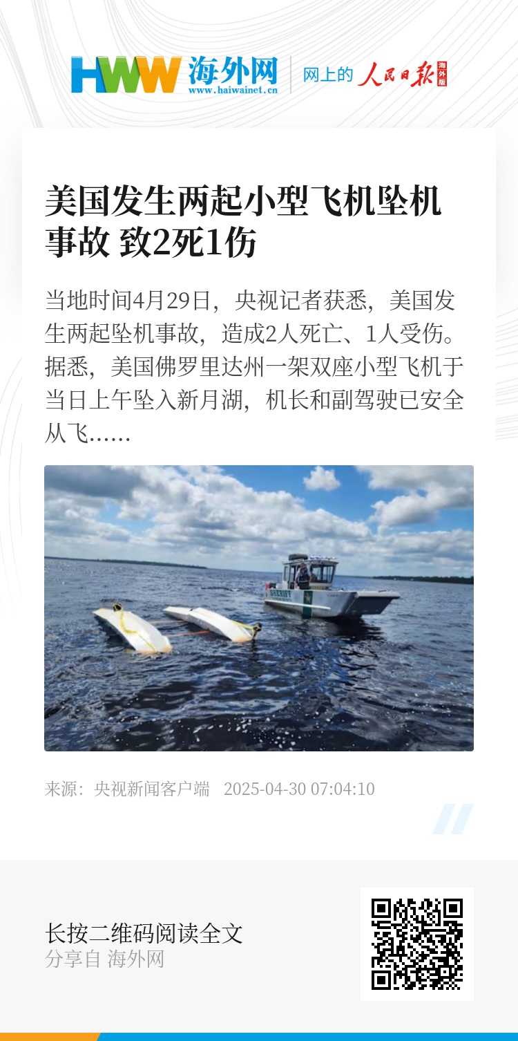 当地时间4月29日,央视记者获悉,美国发生两起坠机事故,造成2人死亡、1人受伤。