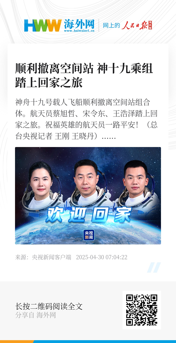 神舟十九号载人飞船顺利撤离空间站组合体。航天员蔡旭哲、宋令东、王浩泽踏上回家之旅。