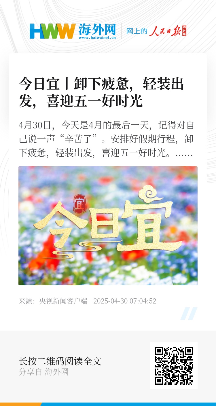 4月30日,今天是4月的最后一天,记得对自己说一声“辛苦了”。安排好假期行程,卸下疲惫,轻装出发,喜迎五一好时光。