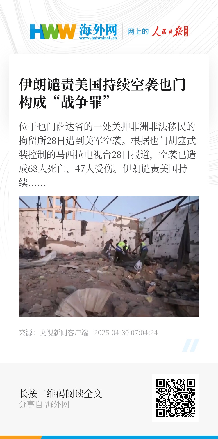 位于也门萨达省的一处关押非洲非法移民的拘留所28日遭到美军空袭。根据也门胡塞武装控制的马西拉电视台28日报道,空袭已造成68人死亡、47人受伤。伊朗谴责美国持续空袭已构成“战争罪”。