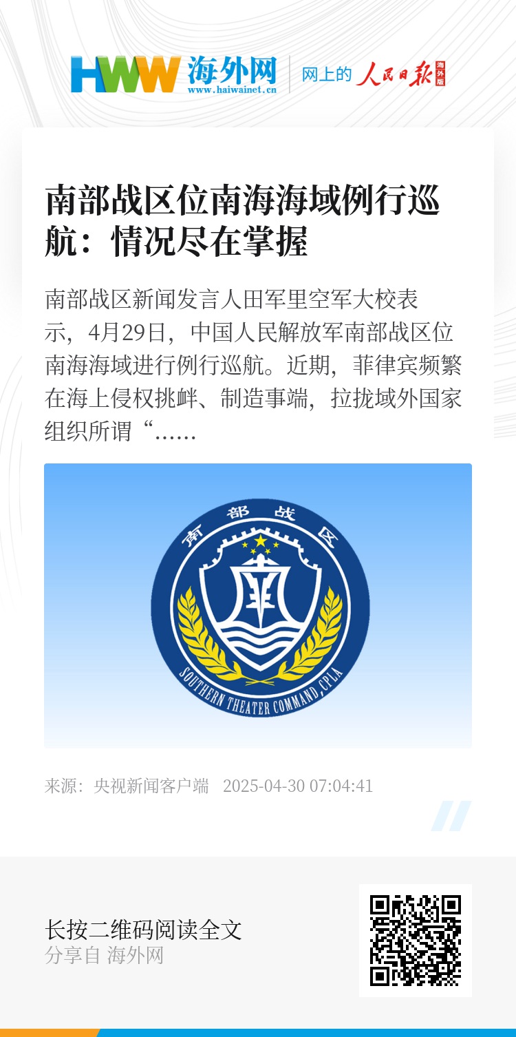 近期,菲律宾频繁在海上侵权挑衅、制造事端,拉拢域外国家组织所谓“联合巡航”,中国人民解放军南部战区海空兵力全程跟监警戒,情况尽在掌握。战区部队持续保持高度戒备,坚决捍卫国家领土主权和海洋权益,坚决维护南海地区和平稳定。