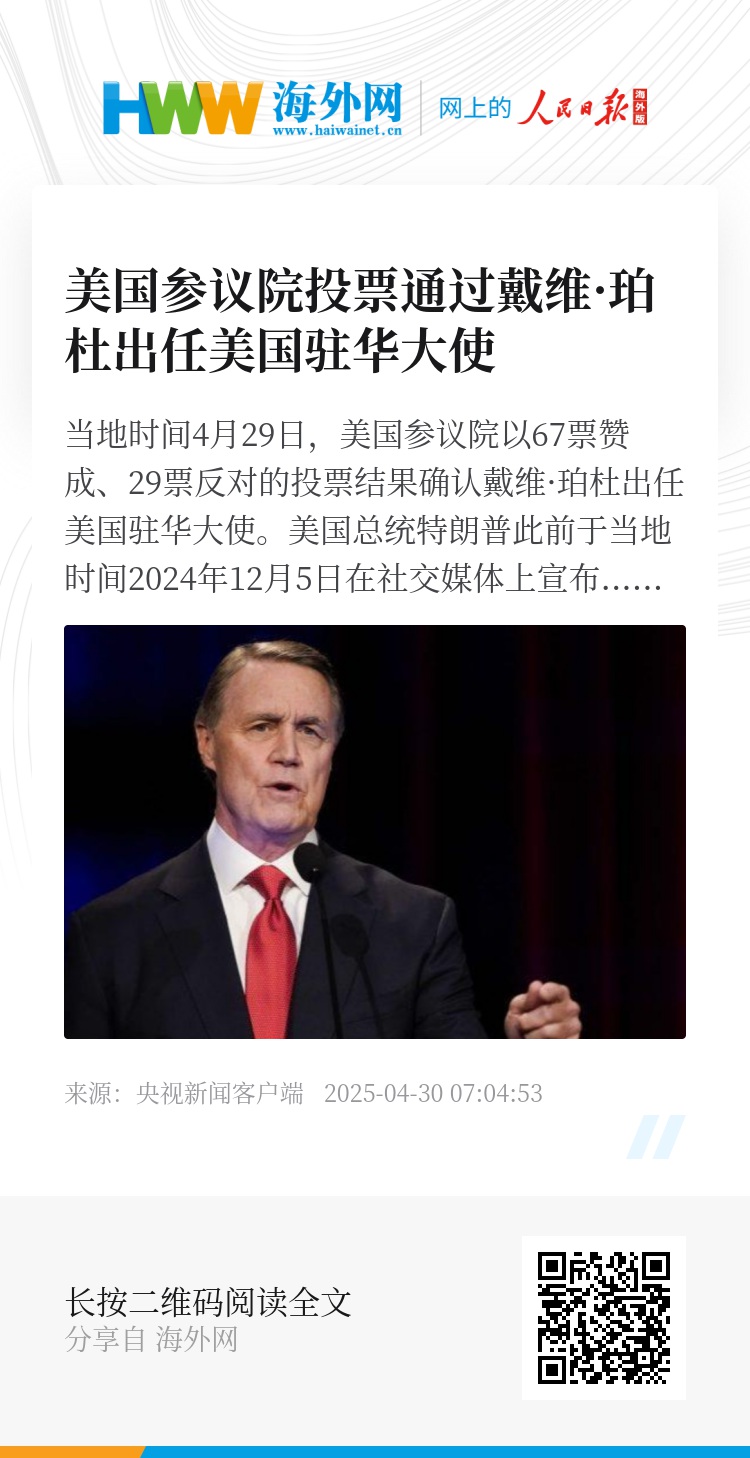 当地时间4月29日,美国参议院以67票赞成、29票反对的投票结果确认戴维·珀杜出任美国驻华大使。
