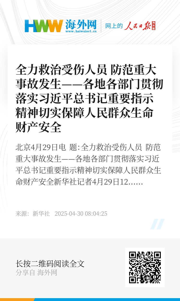 新华社北京4月29日电 题:全力救治受伤人员 防范重大事故发生——各地各部门贯彻落实习近平总书记重要指示精神切实保障人民群众生命财产安全