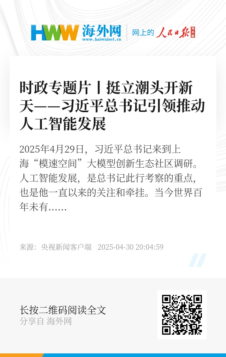 2025年4月29日,习近平总书记来到上海“模速空间”大模型创新生态社区调研。人工智能发展,是总书记此行考察的重点,也是他一直以来的关注和牵挂。
