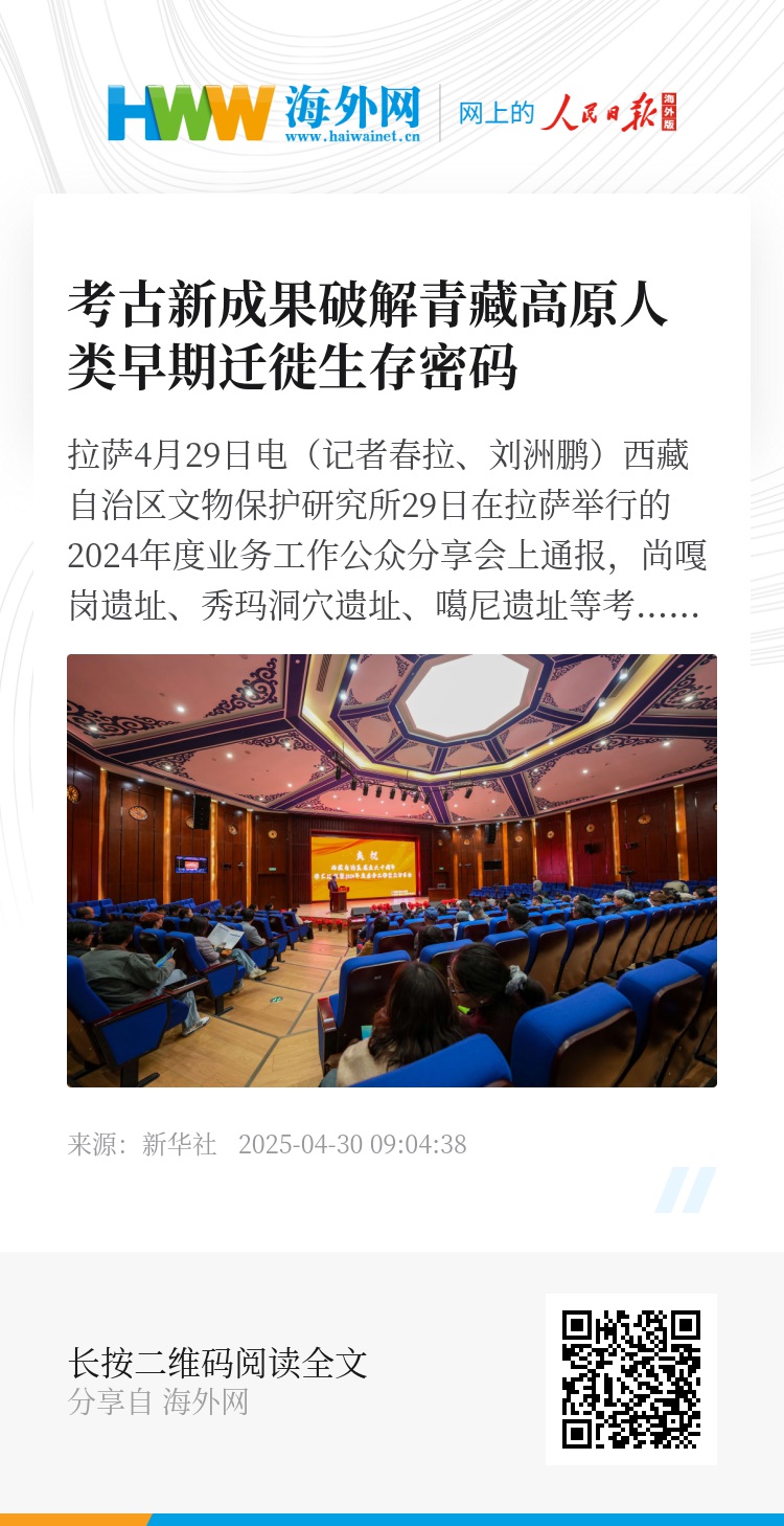 新华社拉萨4月29日电(记者春拉、刘洲鹏)西藏自治区文物保护研究所29日在拉萨举行的2024年度业务工作公众分享会上通报,尚嘎岗遗址、秀玛洞穴遗址、噶尼遗址等考古项目,为破解青藏高原人类早期迁徙生存密码,构建西藏考古学文化石器时代时空框架提供了重要实物资料。