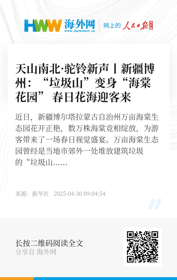 万亩海棠生态园曾经是当地市郊外一处堆放建筑垃圾的“垃圾山”,有50多米高,多年前是当地人的“心病”。2016年,博乐市政府下定决心开始治理,从粉碎垃圾到覆土植树,把“垃圾山”规划成为生态园。据亲历者回忆,最多时一天有1万人同时参与植树。随着生态环境逐渐改善,越来越多的动物在这安家。候鸟成群,游客驻足……曾经的“垃圾山”变身为风光旖旎的大花园。