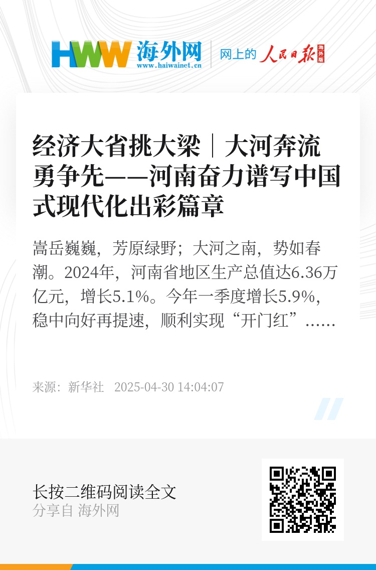 2024年,河南省地区生产总值达6.36万亿元,增长5.1%。今年一季度增长5.9%,稳中向好再提速,顺利实现“开门红”。